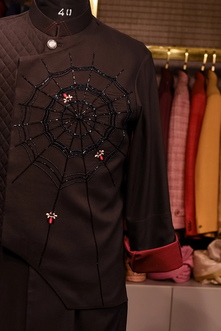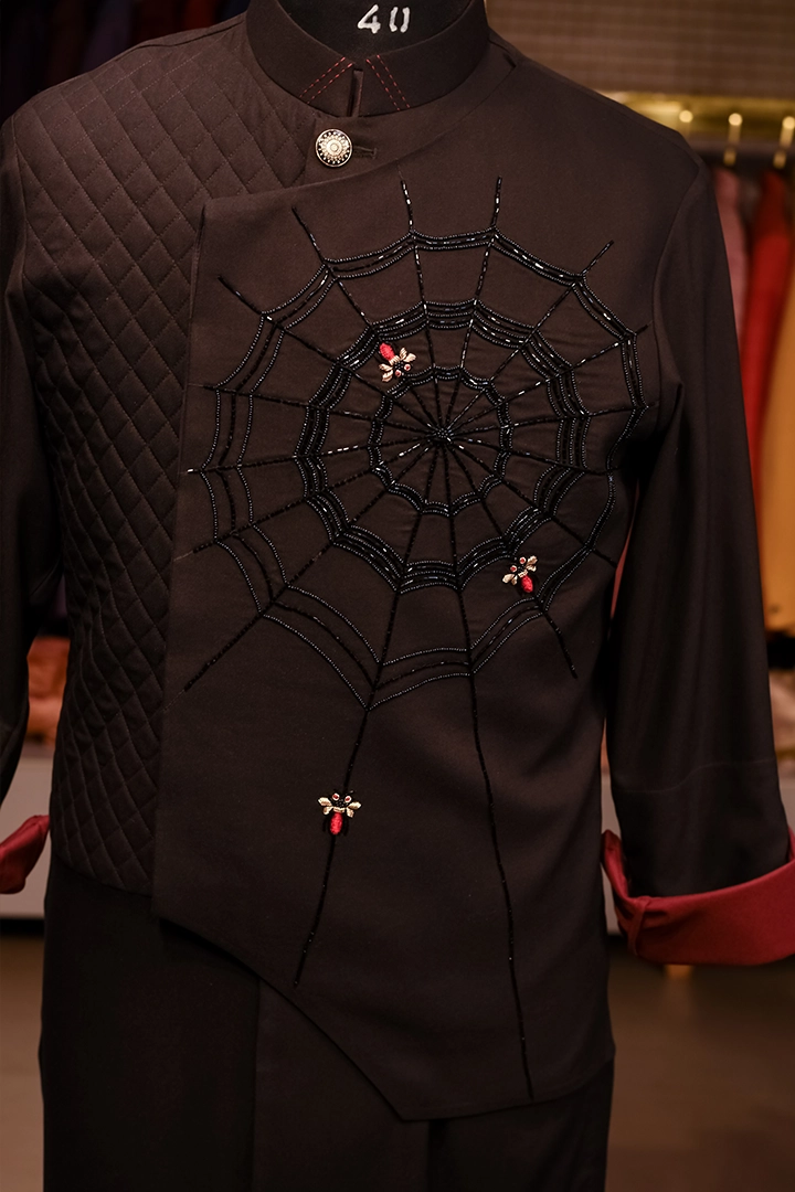 A striking Black Kurta Set featuring intricate spider embroidery, elegant quilting, and signature third-fold detailing. Crafted from premium imported suiting fabric, this ensemble blends contemporary design with refined craftsmanship, making it a standout choice for modern festive and evening wear.