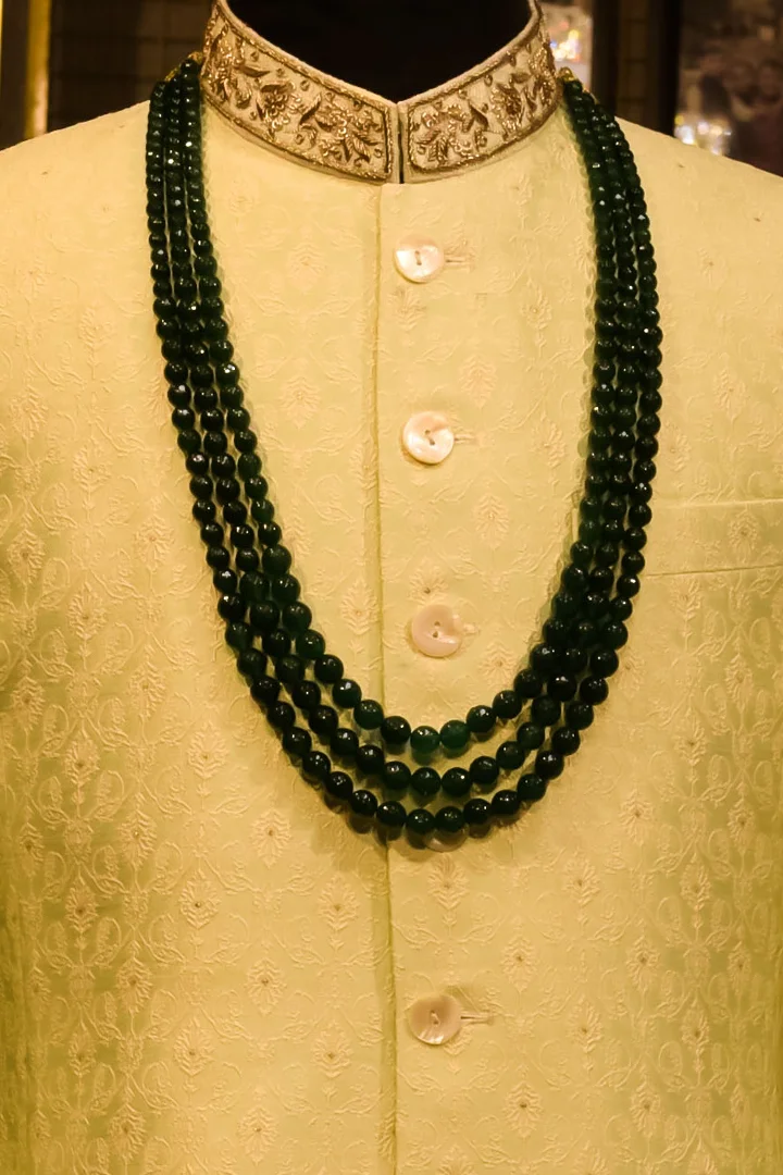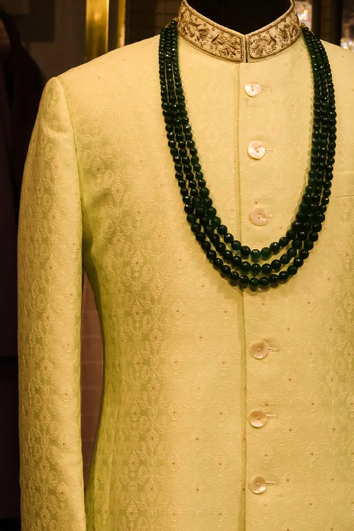 A refined Pastel Green Indowestern set crafted in premium brocade fabric, known for its rich texture and understated sheen. The delicately designed collar work adds a touch of sophistication, balancing tradition with a clean, contemporary silhouette. Paired with off-white trousers, this ensemble exudes subtle luxury and effortless elegance.