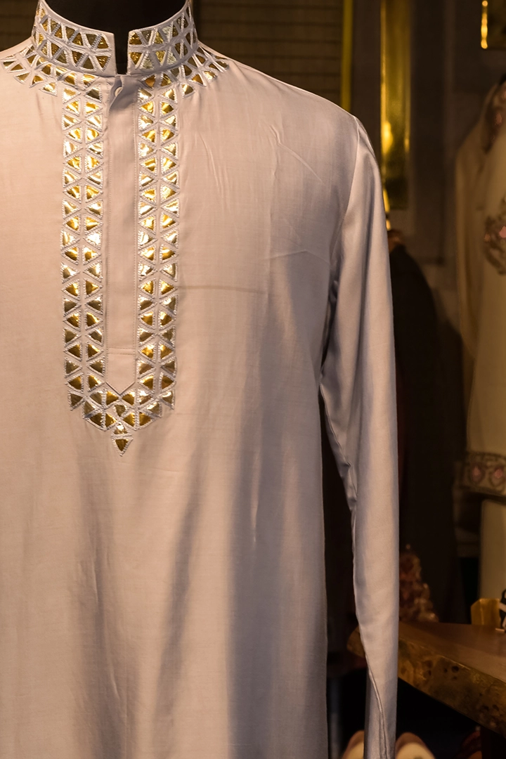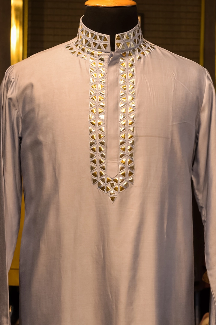 A graceful Pastel Purple Cotton Silk Kurta embellished with delicate gotta patti work on the collar, neckline, and cuffs. This piece exudes soft sophistication, merging traditional artistry with a contemporary pastel hue perfect for modern celebrations.