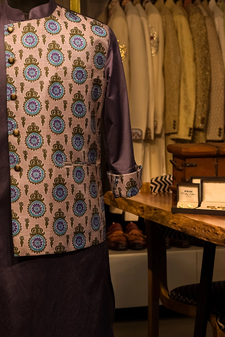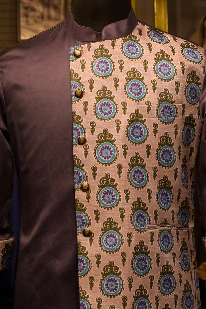A contemporary Purple Cotton Silk Kurta paired with an attached jacket, designed for effortless style and elevated elegance. The structured jacket overlay adds depth and dimension, creating a refined silhouette suitable for both festive and semi-formal occasions.