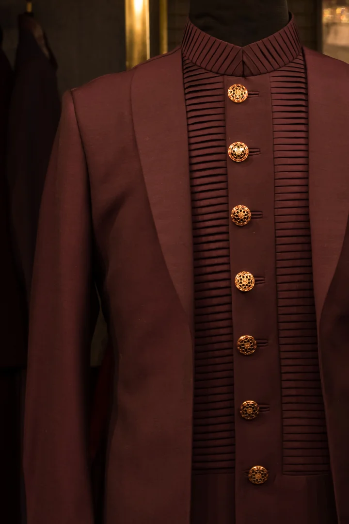 sophisticated fusion of tradition and contemporary design, this wine Indowestern set is crafted from premium worsted suiting fabric. Its rich colour and structured silhouette create a refined and regal statement, perfect for modern celebratory dressing. Designed with clean lines and premium detailing, this outfit embodies understated luxury.